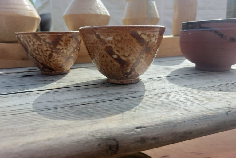 Fürs Drehen verwende ich fertige Tonmischungen, vermische diese aber meist noch einmal untereinander. Die Glasuren entstehen aus verfügbaren Gesteinsmehlen, Kreiden, Tonen, Oxiden und Holzaschen. Sie sind nach dem Brennen über 1230 Grad die funkelnde, feste, lebensmitteltaugliche Oberfläche auf dem hochgebrannten Tonkörper, dem auch schon dichten und sehr festen Steinzeug.